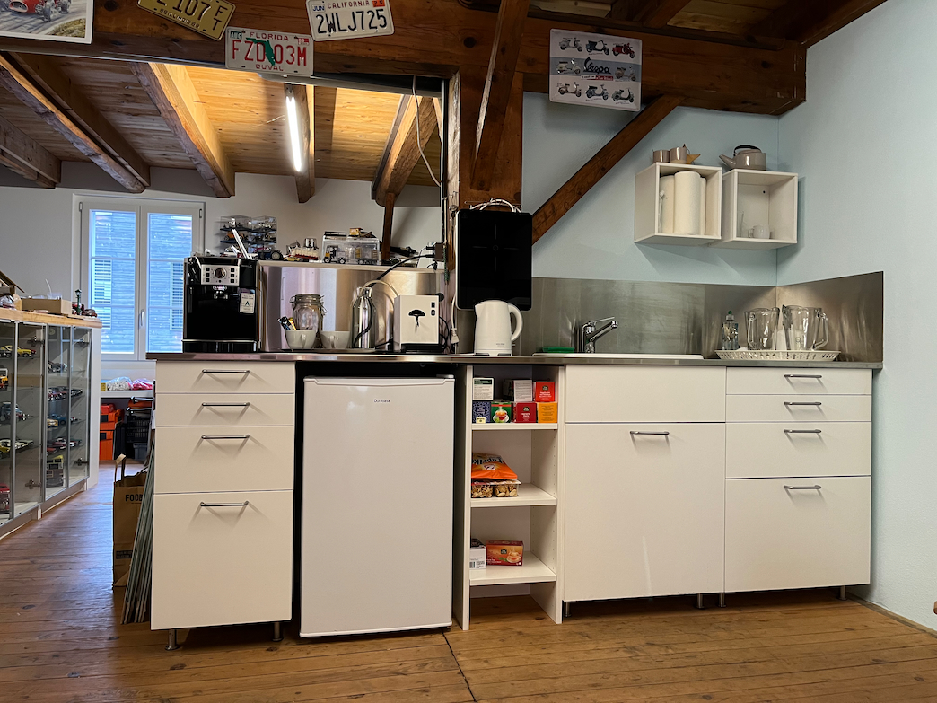 Küche und Besprechungsbereich steht im Erdgeschoss zur Verfügung. Internet, Licht, Strom sind im Mietzins inbegriffen.